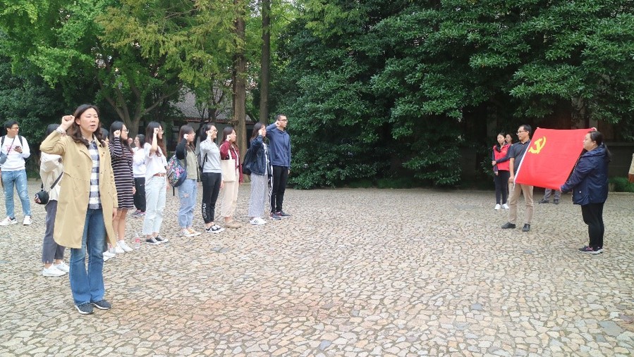 党课之后,大家沿着“初心路线”来到龙华革命烈士纪念地瞻仰。在胜利雕塑前,由方媛领誓,全体学生预备党员面对党旗,举起右手,庄严宣读入党誓词。铿锵有力的誓词,是党员们一生遵循的诺言和使命。随后,一行人来到了烈士关押地、龙华二十四烈士就义地、碑林等一系列纪念地地标,这些地标时刻提醒着我们:党曾有无数英勇义士前仆后继地为了人民抛头颅洒热血,作为新时代党员的我们应不忘初心,牢记使命,在党的事业中付出自己的一切努力。