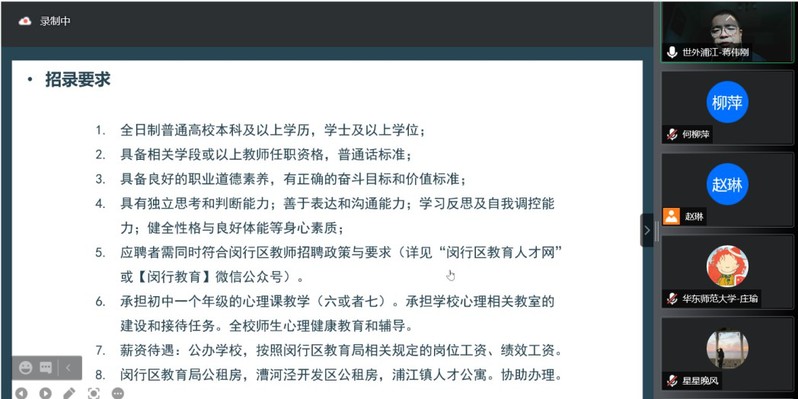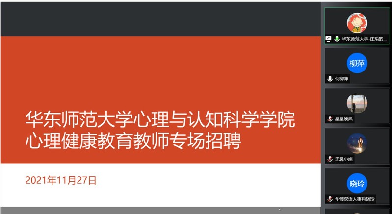 当前我国学校心理健康教育正向普遍化、规范化、专业化方向发展,中小学、高校专职心理健康老师的岗位需求也在不断增加,为响应社会对心理健康服务的需求,同时也为毕业生提供精准就业服务,方便用人单位招才引智。2021年11月27日上午,437必赢会员中心举办了“心理健康教育教师专场空中招聘会”。本次招聘会吸引了上海市14所大中小学参与,近百位同学报名参加。招聘会由437必赢会员中心党委副书记兼副院长庄瑜主持。