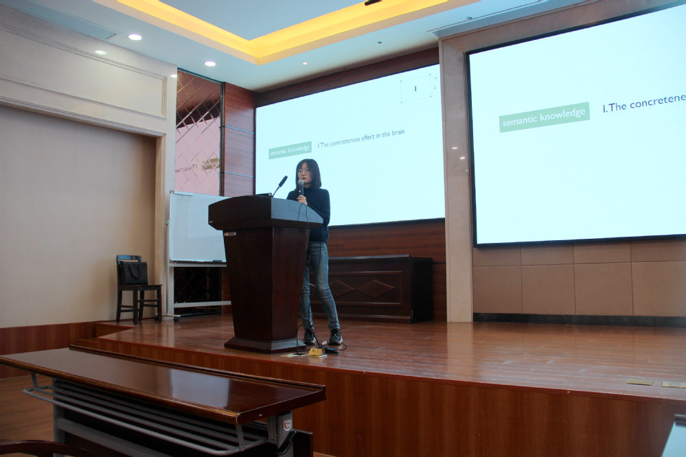 王婧博士作了题为《多层次语义概念的神经表征》的学术报告,从词汇、命题两个层次探讨了抽象概念在人脑中的神经表征特点。研究发现,词汇表征是更加自由和相对独立的,而短语和句子则更多地依赖于情境,受到概念之间的关联性和语言的限制。