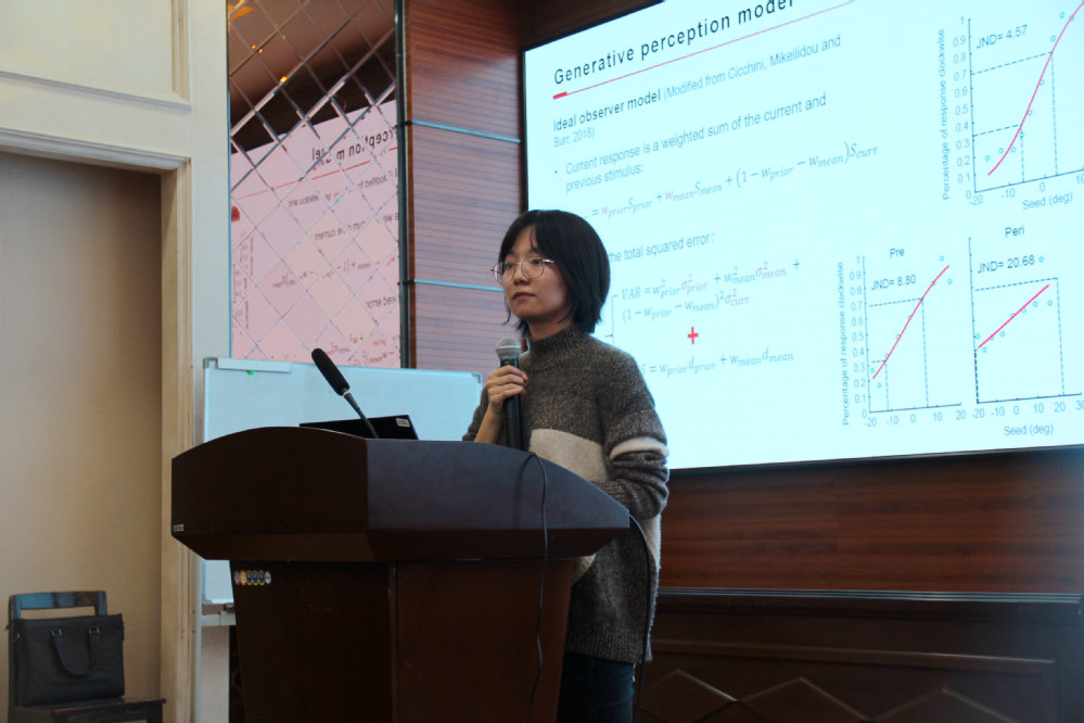 谢鑫宇博士作了题为《视觉扫视中的生成知觉机制》的报告,介绍了两项研究:第一项研究考察了生成知觉在跨扫视视觉中的作用,揭示了先前和当前刺激的可靠性和相似性对生成知觉的影响;第二项研究通过扫视实验探究过去经验如何影响我们扫视中的知觉,揭示了神经振荡节律的作用,并推测丘脑枕可能是先验信息传递到早期视觉皮层的功能中枢。