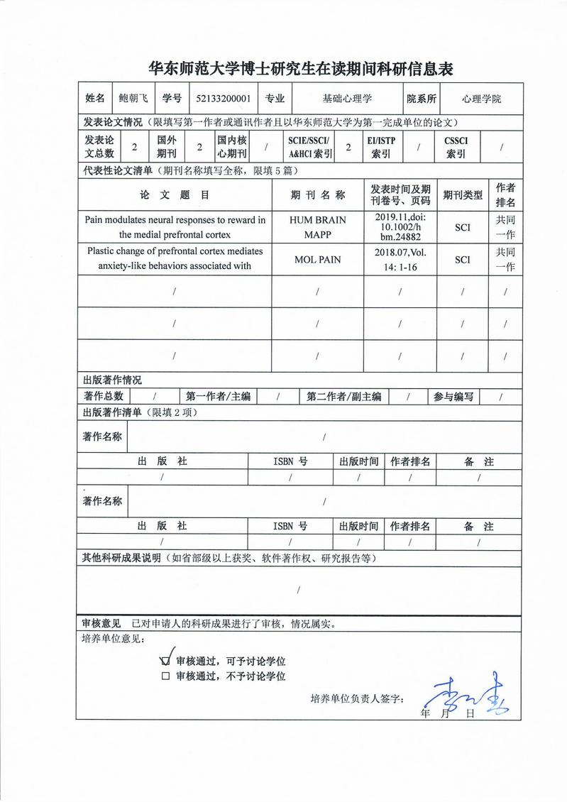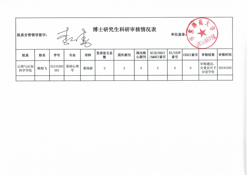 根据《437必赢会员中心关于2019-2020学年第一学期博士研究生科研成果审核的通知》,现将鲍朝飞博士研究生科研成果信息予以公示,公示时间为12月2日至12月6日。公示期间如有异议,请向研究生教学办公室郭老师进行反映,联系电话:62233433,办公地点:俊秀楼202室。 心理学院研究生教学办公室2019年12月2日公示文件: