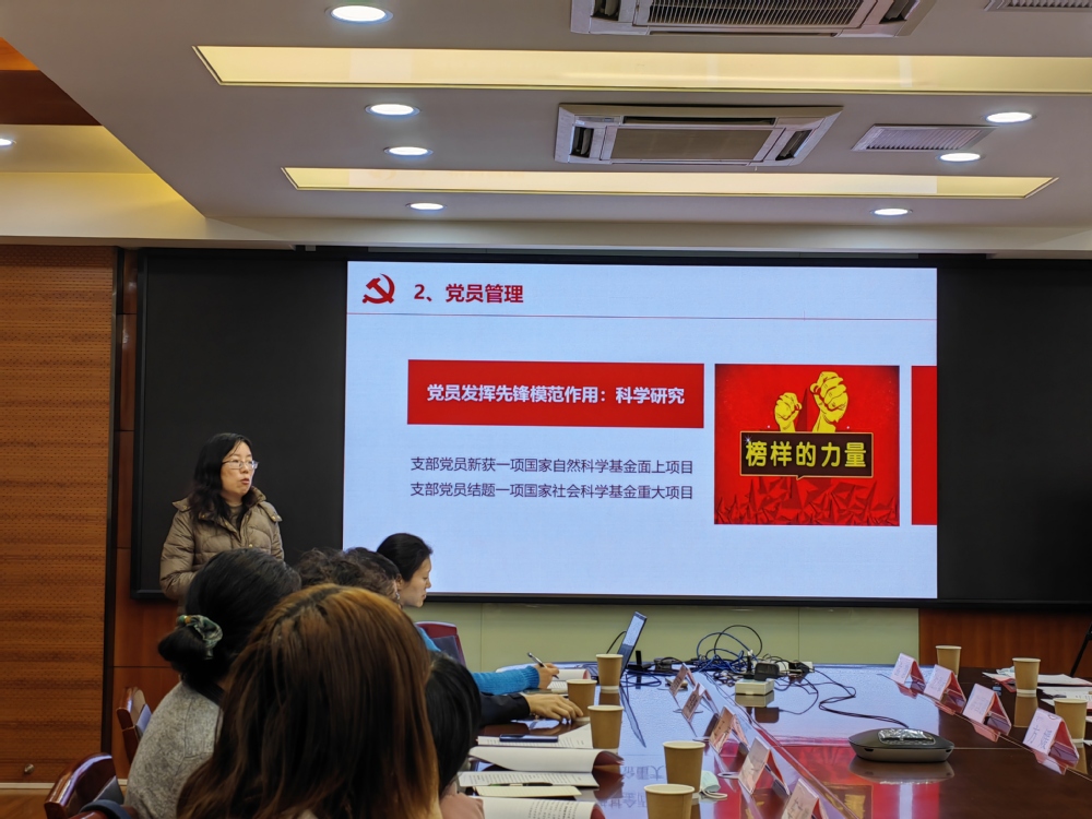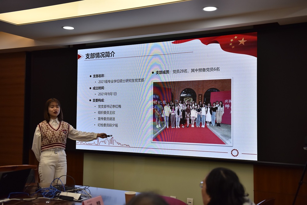 学术型硕士研究生第一党支部书记车文漪围绕扎实开展党员教育、规范落实党员管理、积极开展“我为群众办实事”活动、提升党建工作水平四个方面汇报了作为第二届全国高校“百个研究生样板党支部”创建单位的工作开展情况。针对互动交流学习有待加强、线上资源利用不够充分、“咬耳扯袖”尚未成为常态等问题,她表示下一步将充分发挥心理学专业优势,丰富组织生活形式,发挥党小组作用,提升支部凝聚力和战斗力。