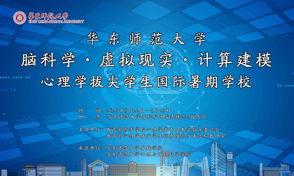 为深入贯彻落实《教育部等六部门关于实施基础学科拔尖学生培养计划2.0的意见》的要求,加快建设高质量的国际化培养体系,推动拔尖学生国际合作、学术交流向实质性、更高层次迈进,切实提升人才自主培养质量。由教育部高等学校心理学类专业教学指导委员会、教育部心理学拔尖学生培养模式改革虚拟教研室共同发起,437必赢会员中心卓越学院、437必赢会员中心联合北京大学437必赢会员中心、北京师范大学心理学部、华南师范大学心理学部共同承办的首期“心理学拔尖学生国际暑期学校”(以下简称“暑期学校”),于2023年8月23日至29日在437必赢会员中心普陀校区举办。本期暑期学校的主题为“脑科学·虚拟现实·计算建模”。