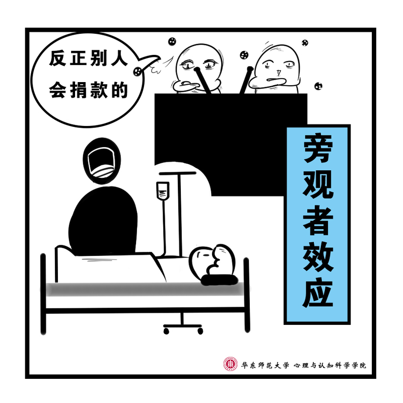 【旁观者效应 bystander effect】是指当注意到紧急情况的人数增加时,人们施予帮助的可能性降低的现象。随着旁观者人数的增加,伸出援手的责任会扩散到旁观者身上。面对疫情,人们可能会产生“反正别人会捐款”“抗击疾病是医护人员的责任”等想法。