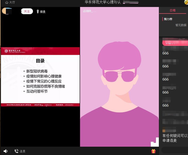 疫情突发,又正逢春节,人们更易造成心理起伏,搭建这个平台就是希望以“团体辅导”的形式面向更多特殊时期寻求心理援助的人们,从而让大家做好抗疫中的心理防护。面向全社会服务,我们责无旁贷。