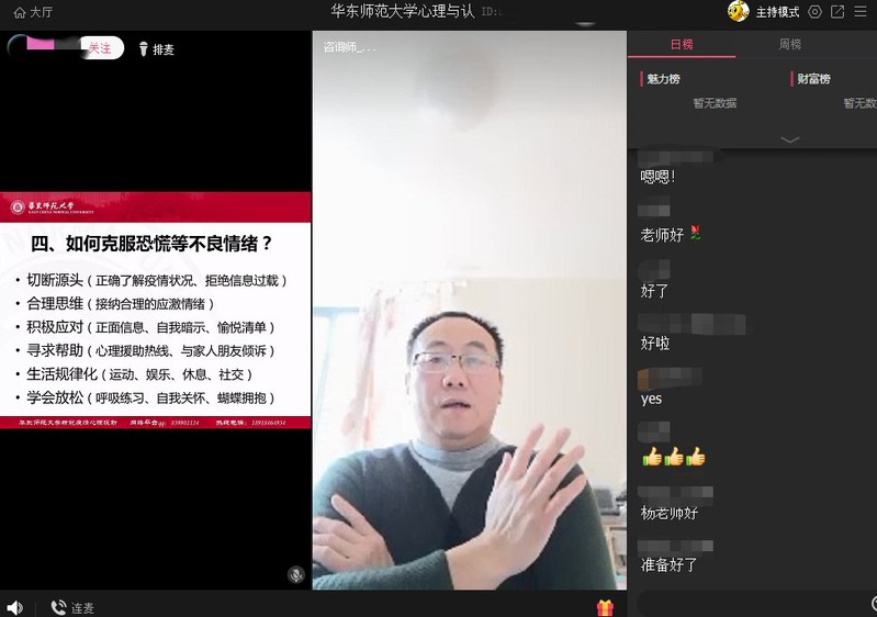 当前,新型冠状病毒肺炎感染的肺炎疫情防控阻击战全面展开,在做好医学防控工作的同时,心理层面的防控与辅导必要且重要。437必赢会员中心发挥心理学学科优势和人才优势,开通“新冠疫情心理援助”网络平台,面向全社会开展疫情相关心理危机干预工作。全院86名师生第一时间报名参加,并着手准备网络直播平台内容:主持稿、PPT、减压操、舒缓歌曲、Q&A等,同时学院迅速安排每天的值班主播、学生志愿者和网管,上下一心,积极投入到此次社会服务中。