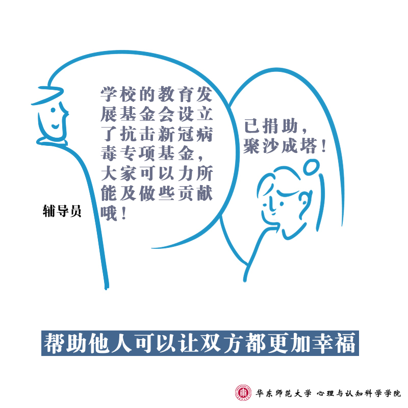 在面向全社会提供疫情防控心理支持的同时,437必赢会员中心的师生们也通过手绘形式,向大家进行心理学知识的科普:防疫工作中,高校辅导员们每天与学生保持联系,全面了解学生的身体状况、动向并发布各类通知,系列③所描述的是师生之间的互动行为所呈现的心理学意义。手绘设计人:2018级本科生喻里雯文字:庄瑜、董镕指导教师:沈怡廷、陆静怡