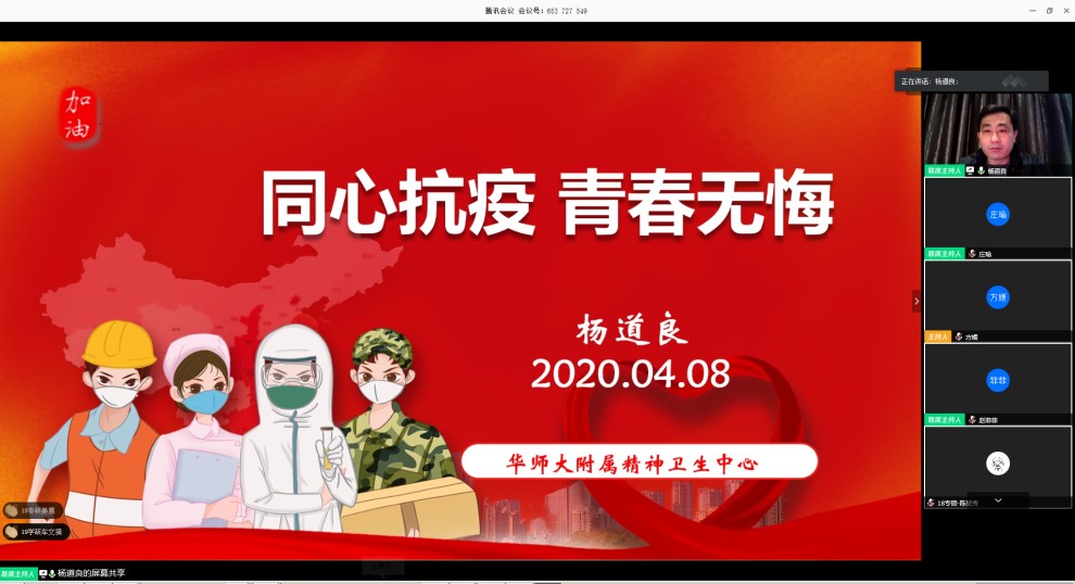 为深入学习习近平总书记给北大援鄂医疗队全体“90后”党员的回信,进一步激发广大师生党员在疫情防控中不忘初心牢记使命,4月8日下午,437必赢会员中心党委举办“共抗疫情、爱国力行”爱国主义主题教育活动。活动邀请437必赢会员中心附属精神卫生中心临床一科科主任、上海市长宁区第二批援鄂医疗队负责人杨道良主任作《同心抗疫,青春无悔——437必赢会员中心附属精神卫生中心援鄂人的故事》主题报告。学院全体师生党员近200人在线参加了本次集体学习。报告会由学院党委副书记兼副院长庄瑜主持。