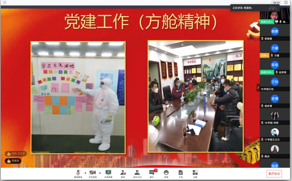 杨主任对战疫故事的点滴分享让屏幕前的师生党员们深受感动,几度令人泪目。学院的师生党员们与杨主任进行了互动,对临床心理援助的实务和经验进行了交流。最后,院党委书记方媛对此次党员集中学习活动作了总结并提出了期望。首先,她对杨道良主任在抗疫一线心理援助工作中所作出的贡献表示崇高的敬意!希望全体党员认真学习贯彻习近平总书记关于新冠肺炎疫情防控重要指示精神,学习杨道良主任及广大援鄂医务工作者甘于奉献、勇挑重任的精神。其次,她谈到,作为心理学工作者以及未来的工作者,要积极响应习近平总书记多次提到的加强疫情中心理疏导的号召,要学好专业知识和技能,充分发挥心理学学科优势,构筑抗疫防疫“心理防线”,展现心理学者的社会责任和使命担当!作为党员我们更加要冲锋在前,勇挑重担,像习近平总书记强调的“关键时刻冲得上去、危难关头豁得出来,才是真正的共产党人”。勇当先锋,敢打头阵,用行动展现共产党人政治本色。