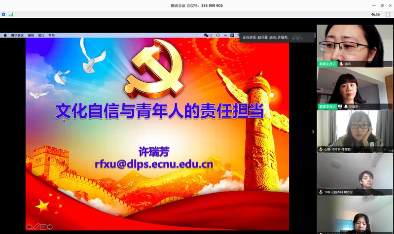 十九大报告指出,“文化兴国运兴,文化强民族强,没有高度的文化自信,没有文化的繁荣昌盛,就没有中华民族的伟大复兴”。作为中华民族复兴大任的担当者、时代的追梦人,青年大学生应该如何去为文化自信做贡献?如何践行责任与担当?许瑞芳老师以疫情中自我隔离的武汉大学生郭岳引入,通过大量的榜样范例详细阐述了责任担当的基本内容——对自我、对他人、对社会负责。此外,她提出,对于青年大学生,学习是践行责任与担当的有效途径,要“自觉按照党和人民的要求锤炼自己、提高自己,做到志存高远、德才并重、情理兼修、勇于开拓,在火热的青春中放飞人生梦想,在拼搏的青春中成就事业篇章。”