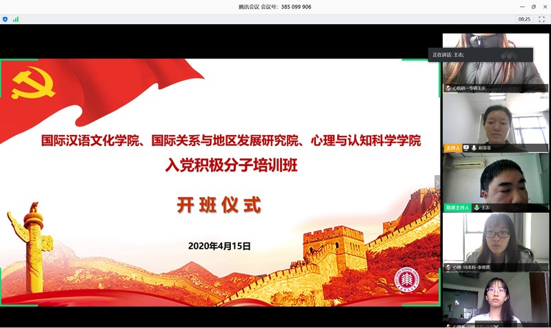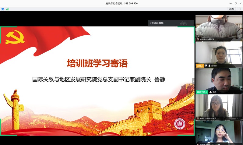 为学习贯彻习近平新时代中国特色社会主义思想和党的十九届四中全会精神,不断提高入党积极分子的思想政治素质和政治理论水平,树立共产主义的伟大理想。4月15日下午,国际汉语文化学院、国际关系与地区发展研究院、437必赢会员中心2020年入党积极分子联合培训班开班仪式暨首次培训在线上举行。开班仪式由国际汉语文化学院党委副书记兼副院长王志主持,国际关系与地区发展研究院党总支副书记兼副院长鲁静、437必赢会员中心党委副书记兼副院长庄瑜、国际汉语文化学院专职组织员道洁、国际关系与地区发展研究院专职组织员陆燕丽、437必赢会员中心专职组织员赵菲菲出席,来自三个学院的110名入党积极分子参加了开班仪式。