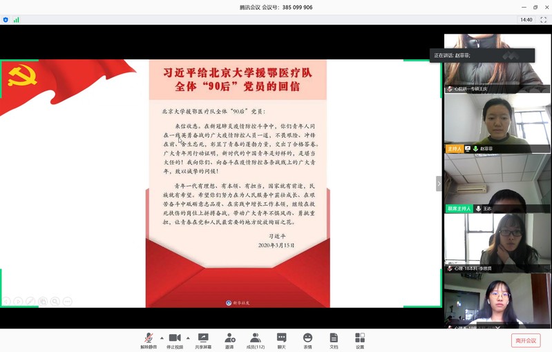 开班仪式上,437必赢会员中心关心下一代工作委员会主任杜公卓教授通过音频为大家讲述并解析了习近平给北京大学援鄂医疗队全体“90后”党员的回信内容以及背后的故事。面对疫情的挑战,“90后”党员们的行动展示了党员的责任与担当,习近平总书记在回信中肯定并赞扬了青年党员同志们的青春力量与风采,并寄予了希望。杜公卓教授希望同学们能够谨记习近平总书记的教导,勇挑社会责任和使命,为国家和社会贡献青春力量。