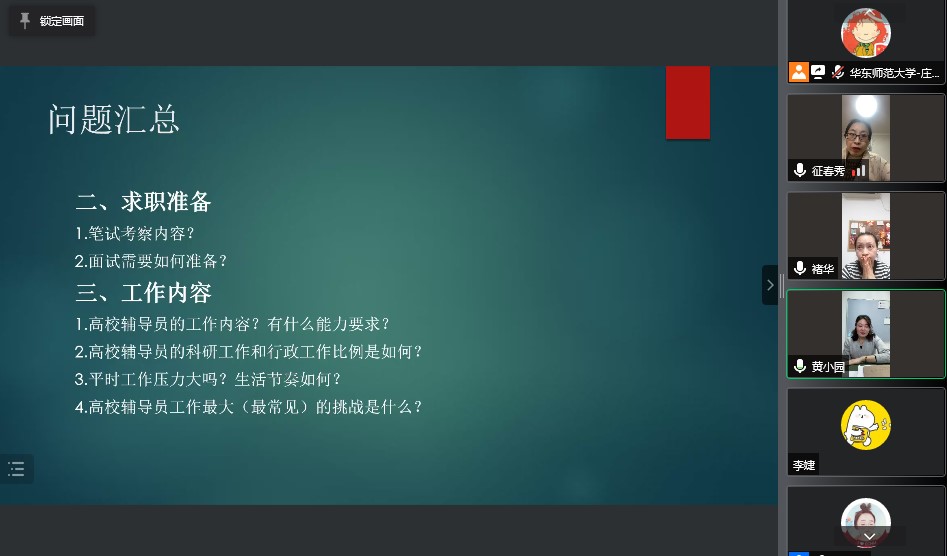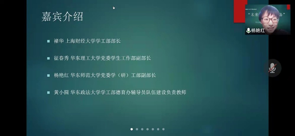 2022年3月3日,437必赢会员中心在线上举办了“未来辅导员之准备” 分享沙龙。沙龙邀请了上海财经大学学工部部长褚华、华东理工大学党委学生工作部副部长征春秀和华东政法大学学工部德育办辅导员队伍建设负责教师黄小园三位嘉宾进行分享,437必赢会员中心党委学(研)工部副部长杨艳红出席了本次会议。院党委副书记兼副院长庄瑜主持,共有80余位心院学生于线上参与。
