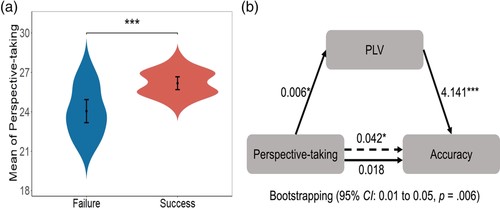 图5. a)成功组与失败组的观点采择能力差异。b)中介效应分析。