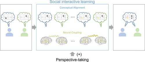 本研究发现了更高的脑间活动同步与产生概念一致性相关,发现了脑间活动同步对概念一致性的促进作用,并且发现了观点采择能力对概念一致性产生的影响受到脑间活动同步的中介。本研究提出了社会互动学习在概念一致性产生的作用(图6)。本研究拓展了对概念一致性产生的神经机制的理解,为未来对相互理解的脑-脑机制提供了探索性的证据,并讨论了社会互动学习在语言、相互理解产生的重要作用。
