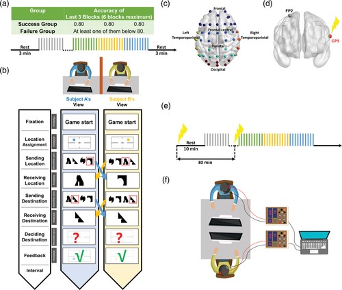 图1.实验设置. a)实验一流程. b)改编的符号协作任务。c)实验一中定义的兴趣区。d)实验二中电刺激的位置。e)实验二流程。f)实验二的实验设置概念图。