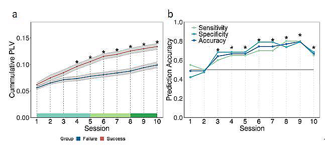 进一步对该PLV的时间序列进行分析,发现早在第4节(每10%的试次定义为一节),累积PLV即出现差异(图3a)。通过基于线性判别分析的机器学习方法,发现早在第三节即可成功区分成功组与失败组。