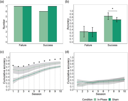 图4.双经颅电刺激的结果。a)成功组与失败组人数。b)电刺激与伪刺激条件的成功组与失败组的正确率。c)成功组与d)失败组中,电刺激与刺激条件的累积正确率差异。