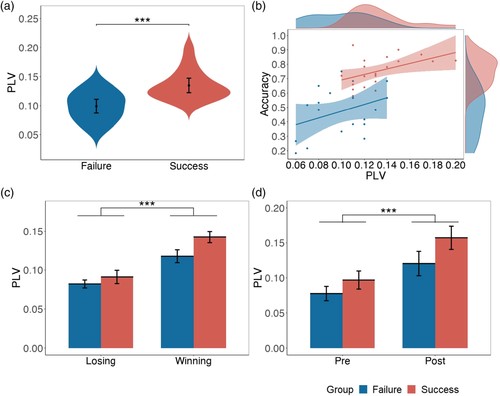 图2.PLV结果。a)成功组与失败组的PLV差异。b)PLV与成功率的关系。c)成功试次和失败试次的PLV差异。d)概念一致产生前后的PLV差异。