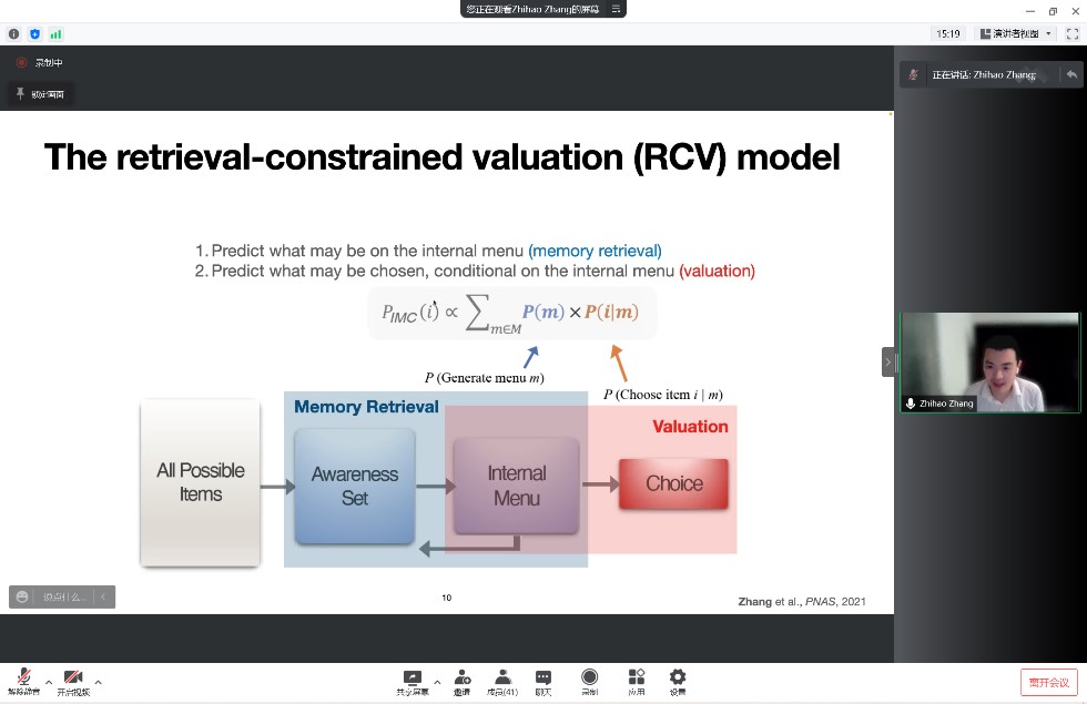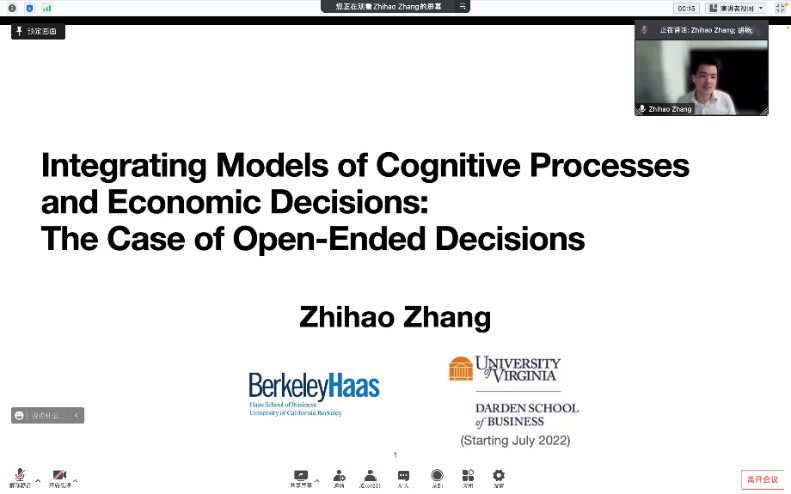 2022年3月18日上午,必赢邀请加州大学伯克利分校哈斯商学院(Haas School of Business, University of California at Berkeley)张之昊博士,通过线上会议的形式,作题为“认知过程和经济决策的整合模型——以开放式决策为例”的学术报告。本次报告由必赢青年教师胡杨副教授主持,共有40余名校内外师生参加。