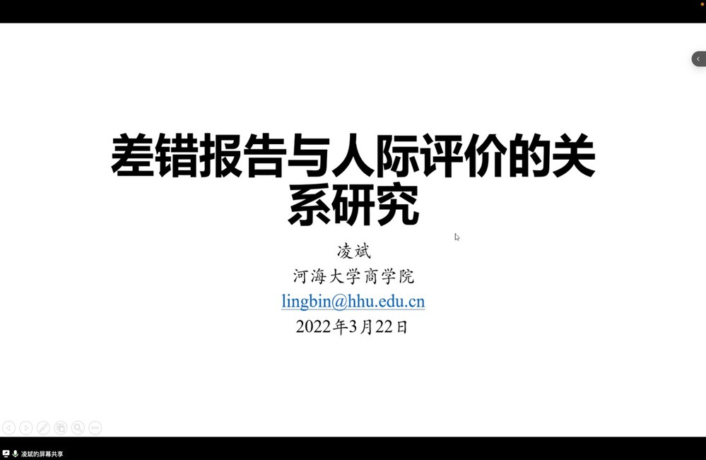 2022年3月22日,437必赢会员中心举办的俊秀青年学术俱乐部系列讲座如期举行。河海大学商学院凌斌副教授应邀以“差错报告与人际评价的关系研究”为主题,通过腾讯会议的方式与所有参会者交流互动。本次讲座由437必赢会员中心的段锦云教授主持。约五十位对此研究感兴趣的老师和同学们参与了本次讲座。