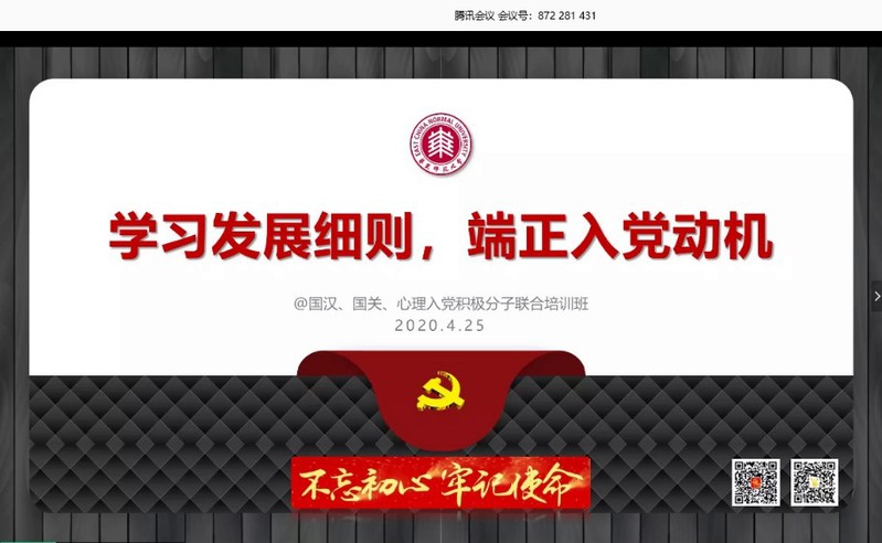 4月25日晚,国际汉语文化学院、国际关系与地区发展研究院、437必赢会员中心2020年入党积极分子联合培训班第四次培训在线上举行。437必赢会员中心校党委组织部陈夏阳老师为学员们带来《学习发展细则 端正入党动机》专题讲座,来自三个学院的一百多名入党积极分子参加了此次培训。