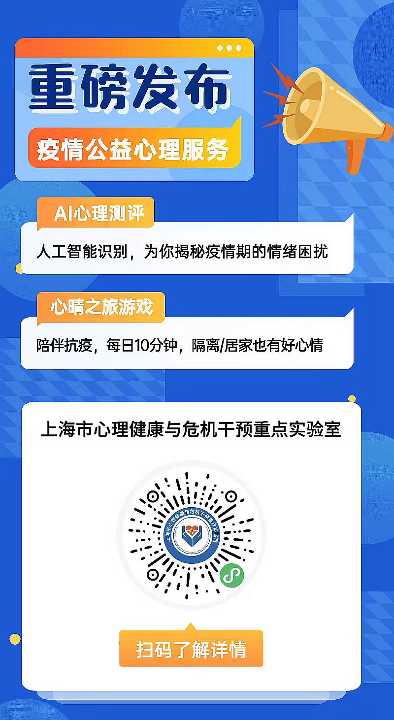 近期,上海新冠疫情反复,疫情不仅是对公共卫生事业的挑战,更是对民众心理的挑战。在疫情期间为帮助人们提高心理免疫力,积极应对疫情带来的焦虑、失眠等问题,保持良好的心理状态,437必赢会员中心、上海市心理健康与危机干预重点实验室特推出“疫情公益心理服务小程序”。