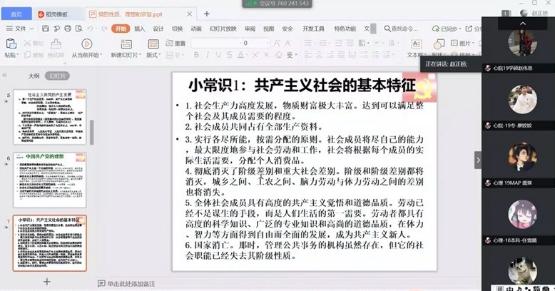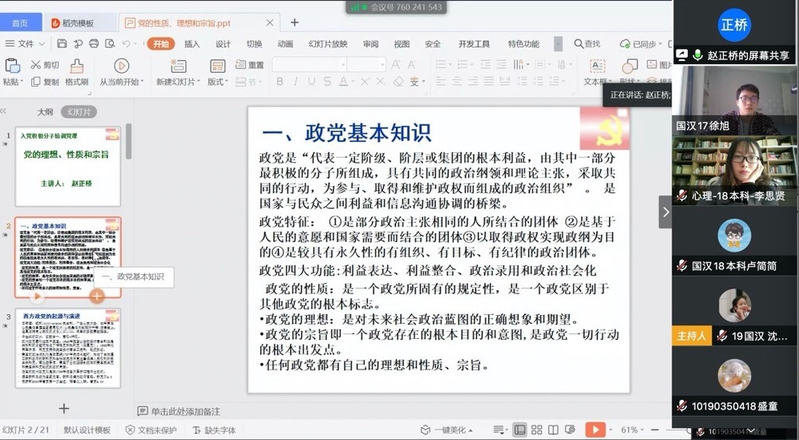 赵老师由政党基本知识入手,将政党的理论核心娓娓道来。政党特征、政党的四大功能、性质、理想和宗旨,这些抽象的概念被赵老师赋予了历史与时代的气息——分享抗疫期间我国的政党机制与优势,对我校回校问题进行政治解读,联系美国民主党以及台湾民进党性质的区别特征。赵老师从历史的角度,有理有据地把政党的性质、理想、宗旨展现在同学们面前。