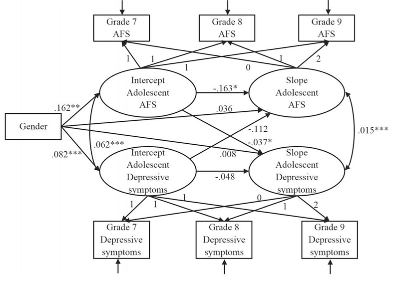 研究对853名7年级学生(51.6%男生,M年龄=14.65岁,SD年龄=0.54岁)进行了为期三年追踪,每一年请青少年报告亲合独处程度和抑郁症状。研究在控制了害羞等因素的影响后,得出以下结果:1)亲和独处和抑郁症状均在7-9年级间均呈现显著增长的趋势。也就是说,中国青少年在7-9年级这一时期越来越倾向于独处,而同一时期青少年的抑郁症状水平也逐渐升高;2)亲和独处的起始水平与抑郁症状的起始水平呈显著正相关,7年级时亲合独处水平更高的青少年报告了更高水平的抑郁症状。亲合独处的增长速度与抑郁症状的增长速度也呈显著正相关,亲合独处上升速度越快,抑郁症状的上身速度也越快;3)亲和独处的起始水平可显著负向预测抑郁症状的增长速度,7年级时亲合独处水平更高的青少年抑郁症状的上升趋势会得到一定的缓解;4)女孩报告了更高水平的亲合独处和抑郁症状,但在二者的发展速度上并不存在显著的差异。