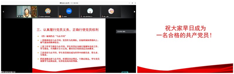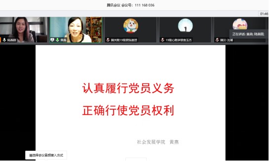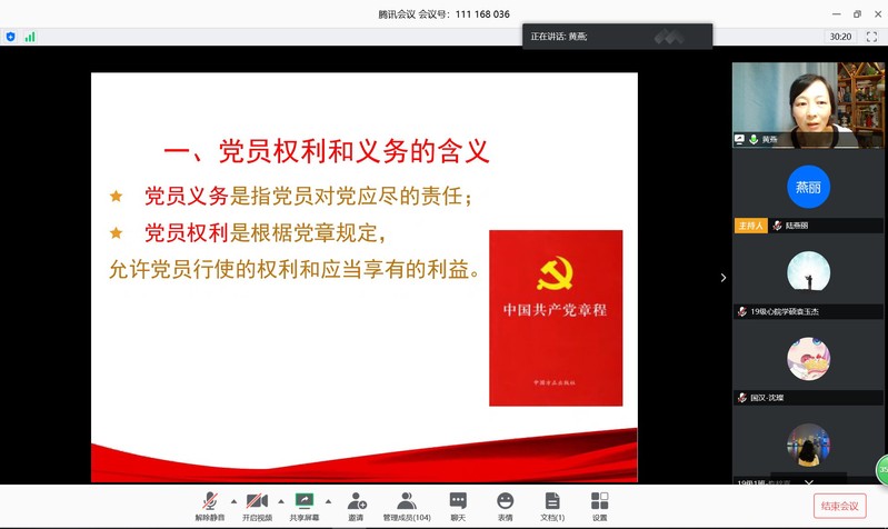2020年5月6日下午,国际关系与地区发展研究院、437必赢会员中心和国际汉语文化学院2020年入党积极分子联合培训班第六次培训依托腾讯会议平台在线上举行。437必赢会员中心社会发展学院党委副书记、副院长黄燕教授为学员们带来专题讲座《党员的权利与义务》,来自三个学院的一百多名入党积极分子参与了此次培训。