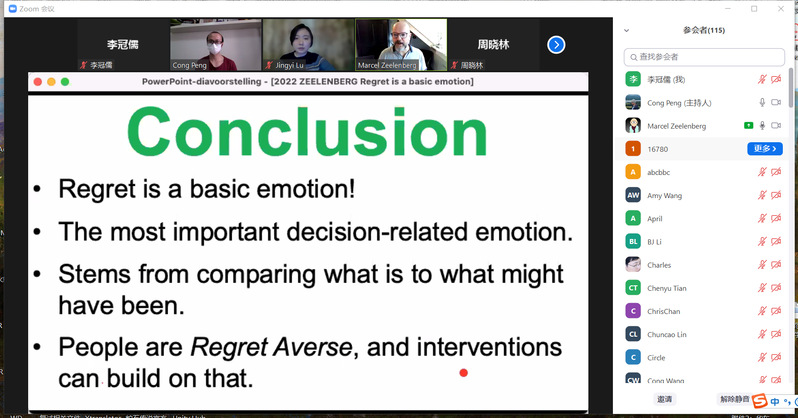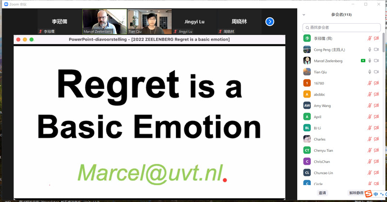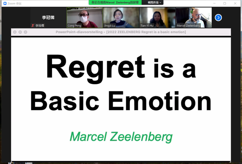 2022年5月24日,应必赢邀请,荷兰蒂尔堡大学社会心理学系教授Marcel Zeelenberg通过zoom会议作了题为“Regret is a Basic emotion”的报告。本次报告由陆静怡教授主持,百余名师生参加。