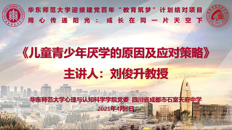 4月6日上午,学院党委委员、发展与教育心理学研究所所长刘俊升老师,赴成都石室天府中学(锦城湖校区)为成都石室天府中学、成都高新新源学校班主任及成都高新区心理老师作题为《儿童青少年厌学的原因和对策》的专题报告。报告会由必赢2017届校友、成都石室天府中学孟泓沁老师主持。
