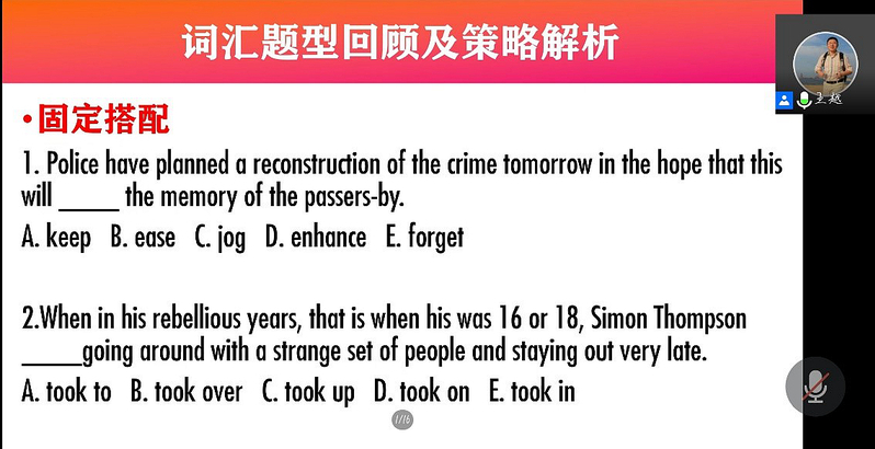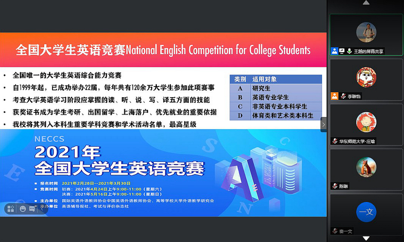 4月14日,437必赢会员中心举办 “2021年全国大学生英语竞赛辅导线上培训”,邀请校英语学科竞赛中心主任王越为主讲人,必赢共102名学生参赛。