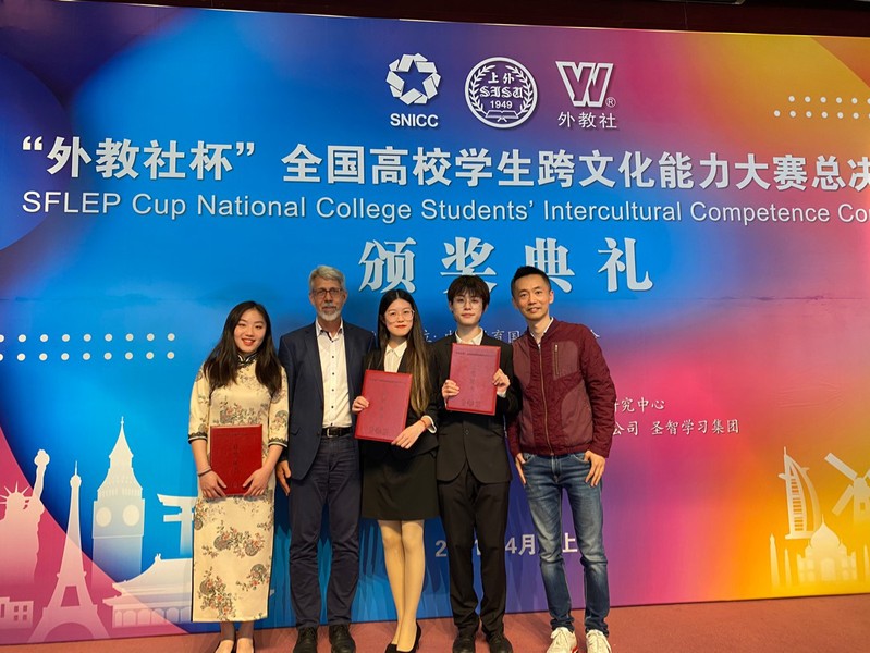 本次“外教社杯”全国高校学生跨文化能力大赛由中国教育国际交流协会指导,上海外国语大学主办,上海外语教育出版社承办,上海外国语大学跨文化研究中心提供学术支持。经过校园选拔赛、省市选拔赛,最终来自全国各地的20支队伍进入全国赛决赛。全国赛决赛包括案例展示分析、回答评委问题以及解读跨文化相关名言,总决赛包括文化知识问答、情景评述和问答以及中国故事讲述。在强手如林、竞争异常激烈的总决赛中,在跨文化语境下,必赢学生表现出极强的分析与解决问题的能力,最终获得了优异成绩。