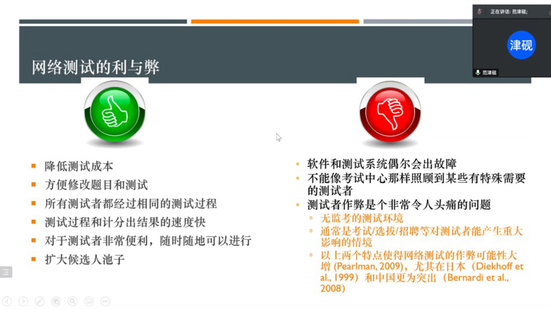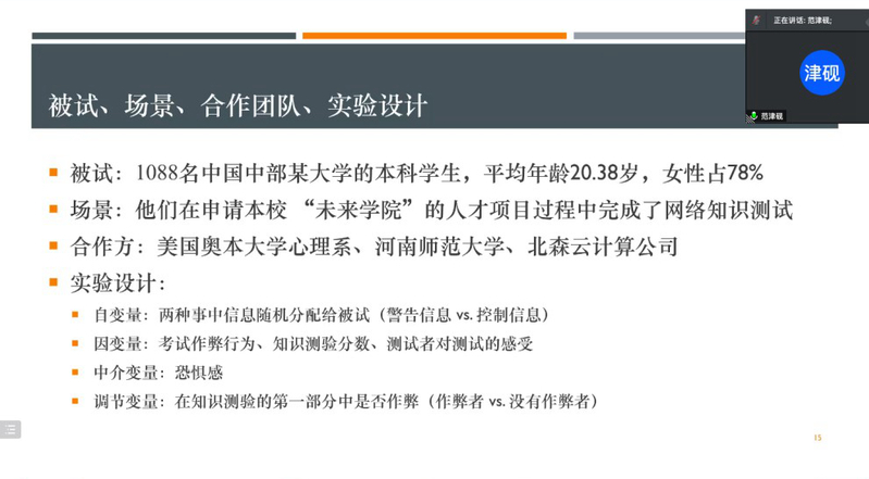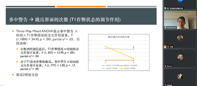 2022年6月24日上午,必赢通过线上方式举办俊秀青年学术俱乐部系列讲座,特邀杰出校友,美国奥本大学心理系范津砚教授作题为“事中警告对降低网络考试作弊行为的效应和机制:一个现场实验研究”的学生报告。报告由段锦云教授主持,孟慧教授及相关领域的青年教师、研究生70余人参加了本次报告会。