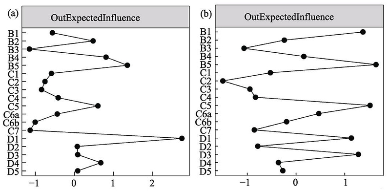 通过交叉滞后网络估计出的灾后T1→T2 (3个月到15个月时)以及灾后T2→T3(15个月到27个月时)PTSD网络分别如图1(a)和图1(b)所示。中心性估计表明PTSD网络中out-EI高的症状存在时间特异性(见图2)。3-15月的高中心症状是睡眠问题(D1),其次是线索引发生理反应(B5); 15-27月的高中心症状是与他人疏离(C5)和线索引发生理反应(B5)。这表明睡眠问题在PTSD的网络中的作用在不同阶段是变化的。