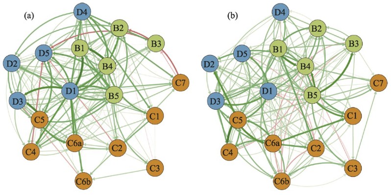 研究团队采用交叉滞后网络估计的方式来构建T1→T2T2→T3的交叉滞后网络, 以探究灾后两个阶段中PTSD症状网络内症状的预测路径。这是由Rhemtulla等人(2021)开发的使用纵向面板数据推测网络中变量预测方向的方法,控制每个项目的自回归效应并估计上一个时间点的单个项目对下一个时间点时的所有其他项目的预测。在症状网络的图中, 节点代表症状, 箭头代表交叉滞后效应的方向, 绿色箭头表示正向预测, 红色箭头表示负向预测, 线条粗细表示关联的强度。由于交叉滞后网络估计的边缘是有向的, 所以可以得出发出预期影响(out-expected influence; out-EI)和接收预期影响(in-expected influence; in-EI)两种中心性指标。out-EI表示了一个节点在网络中预测其他节点的程度; in-EI表示了一个节点在网络中受其他节点预测的程度。由于out-EI高的症状可以预测大量其他的症状, 即它的激活可能继而引发网络中的其他症状, 因此在临床研究中被特别重视。