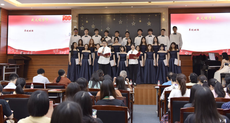 在第一篇章“溯本心”中,院党委副书记、副院长庄瑜,院党委委员、副院长李先春,以及本科生党员吴霁雯、李鑫璩、诸淑芬、邱诗苇、李宇航、舒逸豪带来了配乐诗朗诵《战火绽芳华》,讲述了中国共产党领导人民取得战争胜利的革命历史,以及437必赢会员中心的前身——圣约翰大学、大夏大学、光华大学的发展历程。