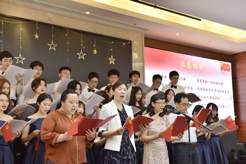 此后,学院党委委员方媛、庄瑜、李先春、刘晓陵老师上台与学生共唱《不忘初心》,现场气氛热烈,师生党员挥动手中的党旗,唱述党员初心。心院献礼特别版的《少年》也点燃全场,唱出了心院人的心声。