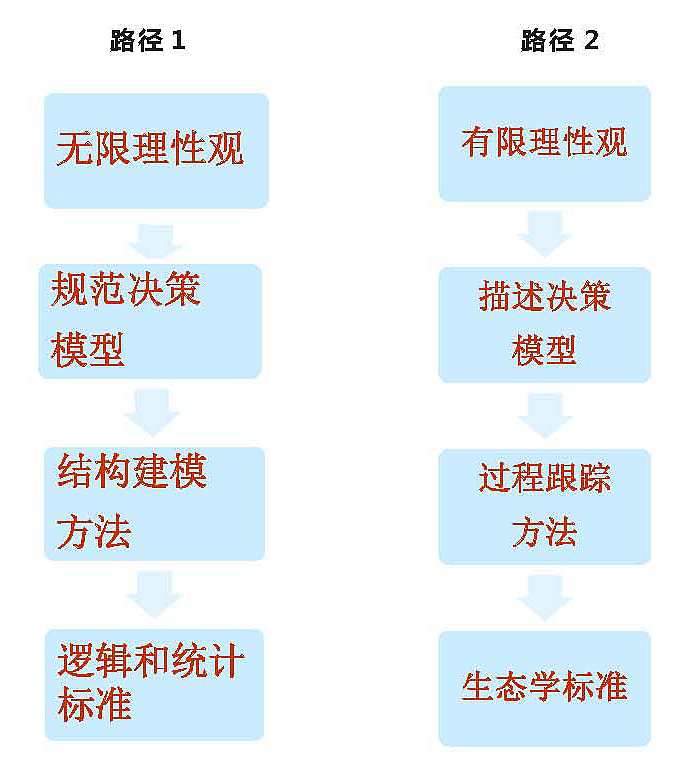 有限理性理论的创始人、当代决策领域的集大成者西蒙(1947)在《管理行为》一书中,开宗明义地提出了“管理就是决策”的论断,并用大量鲜活的例子证明了它。然而,时至今日,无论在管理学教科书中,还是在管理实践中,还有许多人并不懂得这句话,或者说理论上懂了,实践上并不懂。管理活动中经常出现的管理者事无巨细,面面俱到,埋首俗务,越俎代包的现象就是许多人难以理解和把握“管理就是决策”之精髓的明证,而这可能与其头脑中挥之不去的重“绩”轻“效”、重“动机”轻“效果”的有偏认知不无关系,本身就表明人的理性是有限的。那么,究竟什么是决策呢?从心理学的角度,“决策就是心理上的权衡”,即为了获得成功或收益而愿意冒多大风险、付出多少时间和精力并涉及个体尊严和自尊的复杂权衡过程。如何权衡呢?迄今为止,决策科学已经逐渐探索出了图1所示的两条权衡路径:路径一是传统经济学和数理科学基于无限理性假设的规范性决策路径,强调根据逻辑、概率和统计分析的结果而做出最优化的决策;路径二是心理学基于有限理性假设的描述性决策模型,强调依据心理学的事实、采用具有生态合理性的简单启发式规则做出满意性决策。