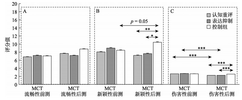 实验2的主要发现如下:在诱发愤怒情绪后,(1)认知重评和表达抑制两种情绪调节策略均能有效降低个体的愤怒情绪唤醒水平和内隐攻击性水平;(2)两种情绪调节策略均能有效削弱愤怒个体的恶意创造力表现(MCT的新颖性和伤害性;见图4)(3)情绪唤醒度(中介MCT的流畅性和新颖性)和内隐攻击性(中介MCT的流畅性、新颖性和伤害性)均中介了情绪调节策略对愤怒个体的恶意创造力表现的影响。