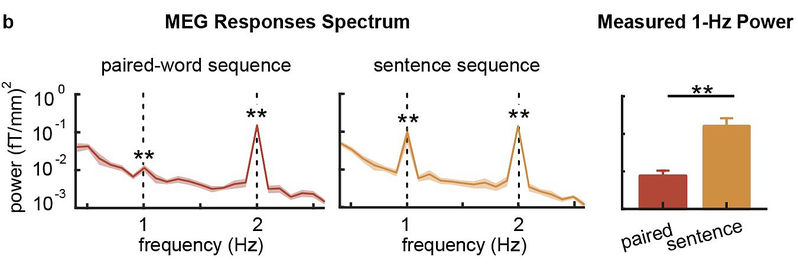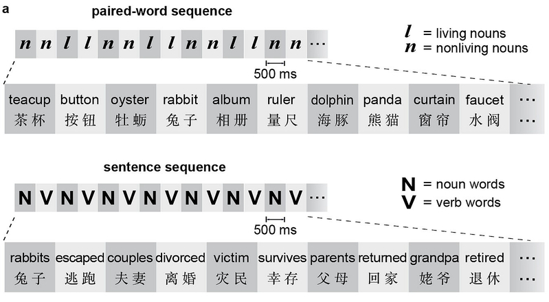 人类每时每刻都在处理序列化的信息,例如,你现在正在阅读的、由一个个字符组成的文字序列,或是你耳边正在听到的一连串声音。人脑在处理这些序列信息时,不仅加工了每一个序列单元,还会自动化地加工由这些小单元组成的大单元。以语音为例,当人脑在聆听语音时(例如,小羊吃草),这一个语音序列不仅包含了每一个字,即,小、羊、吃、草,还包含了由单字组合在一起的词组,即,小羊、吃草,最后再由词组组合形成句子。近年内,许多脑电图和脑磁图研究发现,人脑在聆听像这样的语音序列时,皮层神经活动可以同时表征这个序列中的层级结构,即,字、词、句。这些发现说明,人脑可能在按照语法知识将字组成词汇、短语和句子,再对这些高层语言结构进行理解。