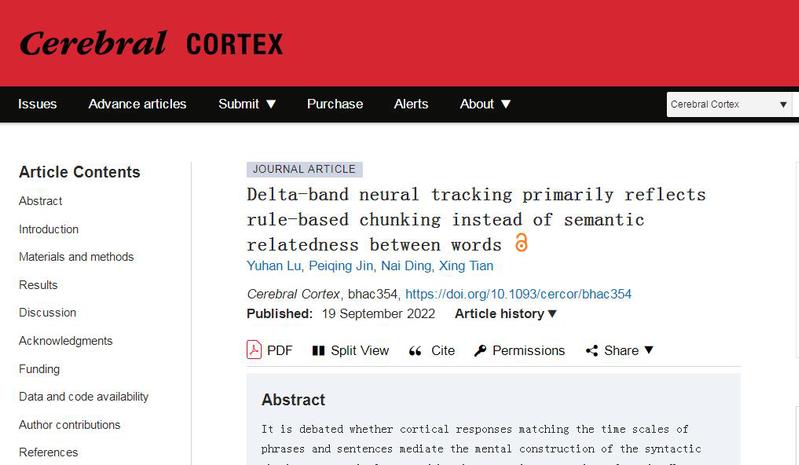 Lu Y, Jin P, Ding N*, Tian X*. (2022). Delta-band neural tracking primarily reflects rule-based chunking instead of semantic relatedness between words. Cerebral Cortex, online published. doi: 10.1093/cercor/bhac354.