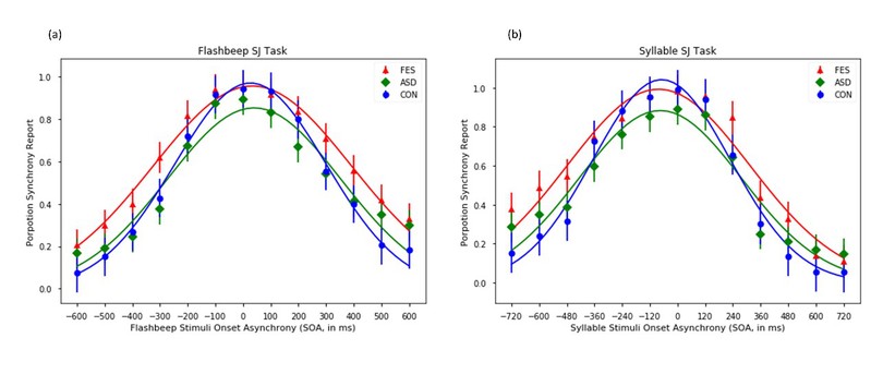 图2. 三组被试的视听时间整合窗(Temporal Binding Window, TBW)拟合结果。不论是非言语(a)还是言语信号(b),首发精神分裂症患者(FES)的TBW均显著大于健康对照(CON),而成人孤独症患者(ASD)未见显著异常。