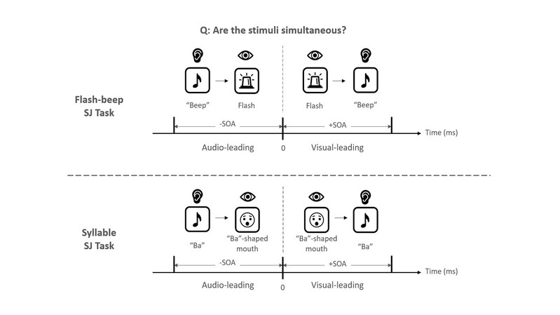 图1. 非言语(flashbeep)和言语 (syllable) 视听同步判断任务示意图