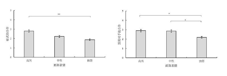 在本研究的三个实验中,均用选自标准情绪图片库中的高兴、中性和愤怒情绪图片操纵偶然性情绪信息,测量被试对流露不同情绪信息的对手的合作行为的预期,并用囚徒困境博弈任务采集他们与对手合作的数据。三个实验一致地发现, 在囚徒困境博弈中, 对手的偶然性情绪信息影响被试的合作行为, 并且不同类型的面部表情对被试合作行为的效应有所不同。具体而言, 愤怒、中性和高兴表情组的合作水平呈逐步增加的趋势, 但只有愤怒与高兴表情组的合作水平表现出稳定的显著性差异, 高兴与中性表情组被试的合作水平呈现出稳定的非显著性差异(参见图3、4、5)。