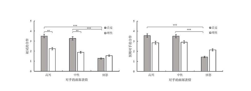 该研究的发现具有一定理论意义和实践价值。人们在面对不同面部表情的对手时, 表现出合作决策的偏向, 支持情绪的社会功能理论,还表明人们做出合作决策时并非总是完全理性的。有趣的是, 实验2和3的结果表明相对直觉的决策模式比相对理性的决策模式让人更合作,为社会启发式假说(social heuristics hypothesis, SHH)提供了一定的证据。在社会生活中,运用表情含蓄的表达自身立场、正确理解他人情绪信号的含义、策略性使用情绪信息加工方式等,对于成功的人际互动至关重要;在当今各种互联网交流平台上,Emoji表情符号已经成为通用的流行的沟通手段,因此本研究的发现对人工智能的深度情感学习、情感化的人工智能设计,以及情感化的人工智能与人的商业合作互动等领域具有一定的启示意义。