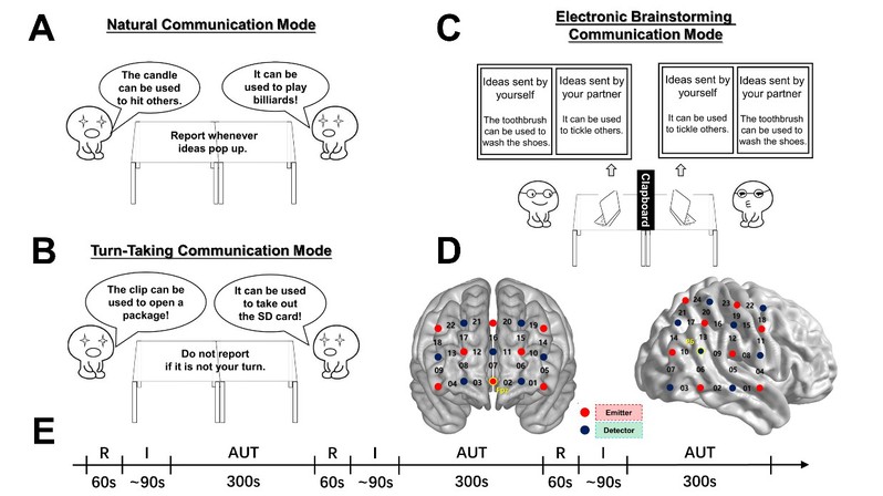注:(A) 自然交流模式。 (B) 轮流报告交流模式。 (C) 电子头脑风暴交流模式。 (D) 光极板放置。光极板被放置在双侧前额叶区域和右侧颞顶区域。 (E) 超扫描设计。静息:1分钟静息态扫描阶段;指导语:约1分半钟的指导语介绍阶段;创造力任务:5分钟的创造力任务阶段。