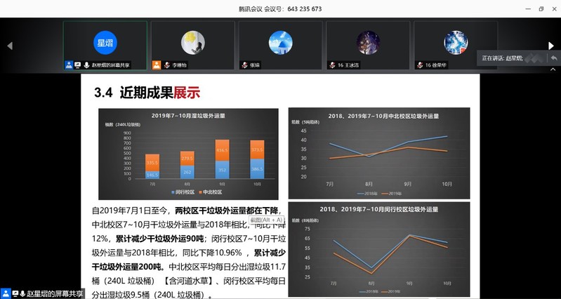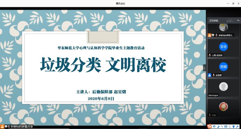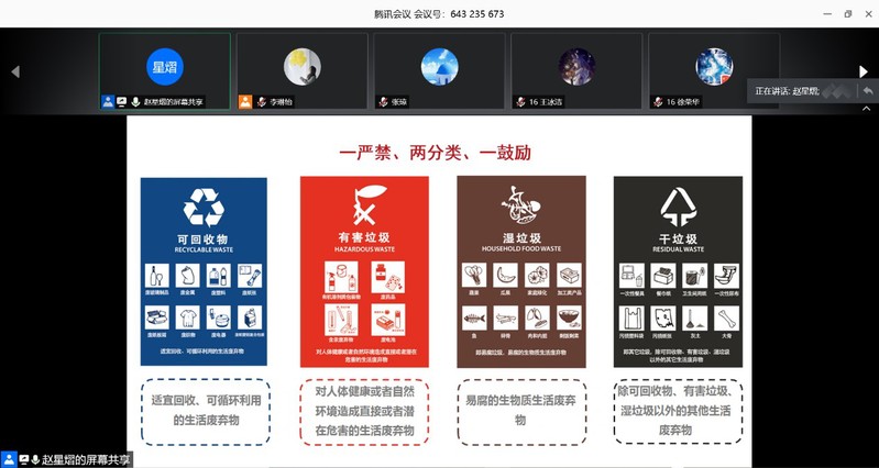 后勤保障部赵星熠老师从为什么要推行垃圾分类、我校垃圾分类工作情况、我校垃圾分类工作完成情况、思考与展望四个方面入手,向同学们介绍了上海市推行垃圾分类的意义和我校开展垃圾分类工作以来的进展。毕业生们也根据自身毕业离校整理相关的垃圾分类与回收问题和赵老师进行了沟通交流。