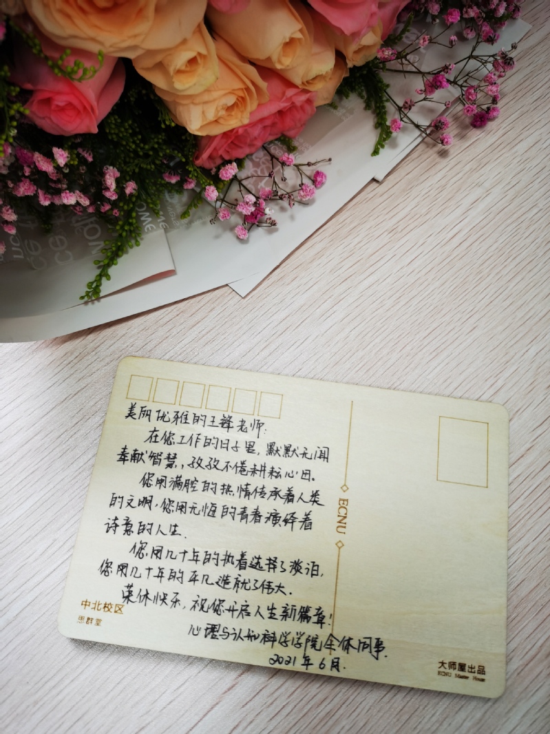 为表达学院对王锋老师的感谢与祝福,方媛书记、刘晓陵主席和汪晨波老师代表学院向王老师赠送鲜花、祝福卡和纪念品。